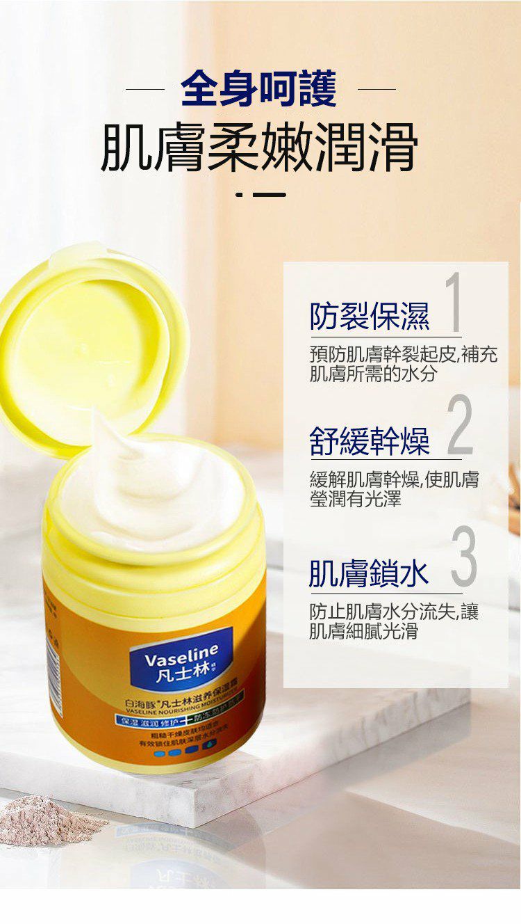 25分鐘前醫師推薦【凡士林滋潤補水保濕霜】#買三送二 到手五盒 一抹即潤 瞬間吸收!保濕修護 清爽不油膩 全身都能用。可以當面霜,護手霜,身體乳使用 - 【買三送二】到手5瓶-NT$899