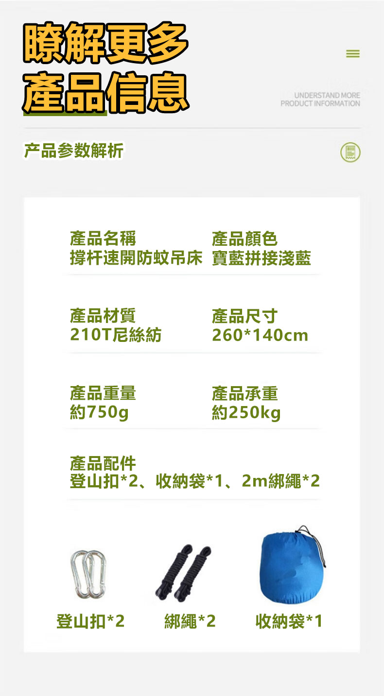 2分鐘前全自動速開戶外帶蚊帳吊床 - 【創意嘗鮮】承重700公斤 速開蚊帳吊床【無蚊帳+三米綁繩+8號扣】/1入組NT$998